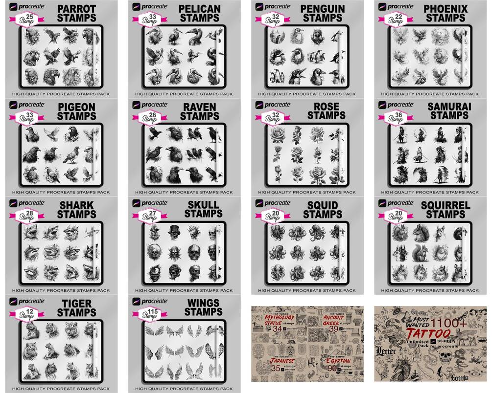 Get creative with the 10,000 Premium Tattoo Stamps bundle, the best set for tattoo and graphic designers. This all-in-one set features an extensive range of high-quality, ready-to-use tattoo designs, including intricate line work, bold symbols, and detailed textures. Perfect for adding depth and flair to your artwork or for fast, impressive stencil applications. Save time, enhance your portfolio, and elevate your tattoo game with the only stamps bundle you’ll ever need. Whether you're creating custom designs or refining your craft, these premium stamps are built for professional results.